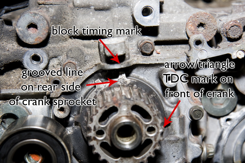 Once you have the crank pulley and timing belt cover removed, you can properly set the timing so the pistons are fully recessed inside the cylinder walls. There are two marks on the crank sprocket: one for Top Dead Center and another for recession. DO NOT set the timing to Top Dead Center: this could cause the valves to open and “kiss” the piston tops, potentially bending the valves. The cam sprockets have timing marks as well to indicate the recessed setting. When this setting is achieved (and you’ve double checked and double checked again) you can begin to remove the timing belt itself.